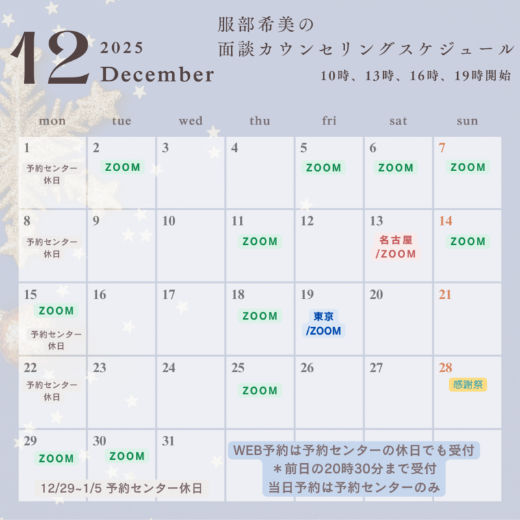 (名古屋・東京のカウンセリングも、大阪のセンターにて承っております) - 『服部希美の面談カウンセリングを受けたい』とお伝えください。